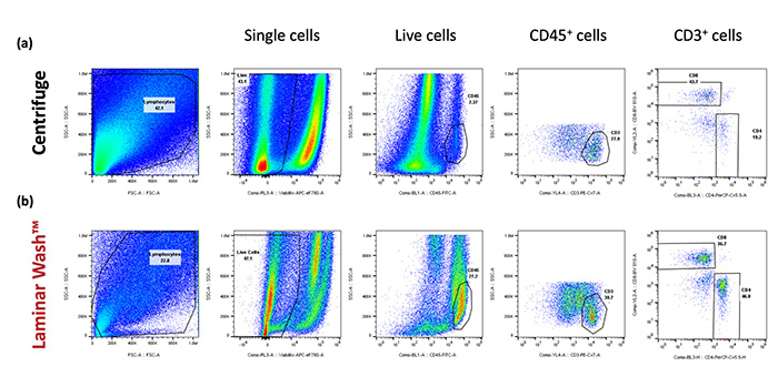 Representative flow cytometry plots comparing centrifuge-based (top) and Laminar Wash™ (bottom) workflows across lymphocyte, single-cell, live-cell, and marker-gated populations.